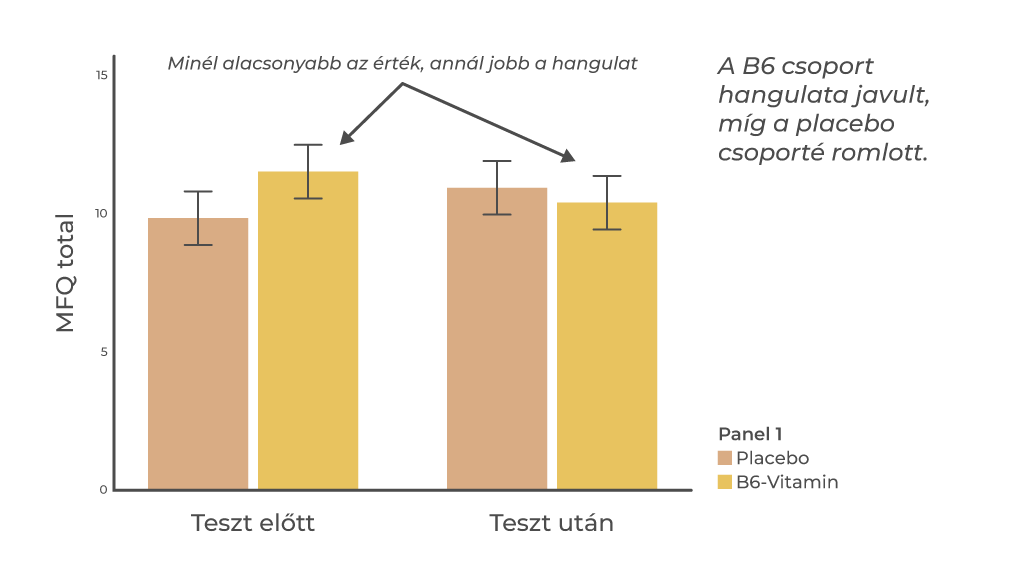 Nagyon jó ábrákkal is szemléltették az eredményeket, amiken jól látható például, hogy a placebo csoport tagjai a vizsgálat előtt jobban szerepeltek a hangulatot/depressziós hajlamot felmérő teszten, de azt követően, a kutatás végére a hangulatuk rosszabbodott. Ezzel szemben azoknak, akik B6-vitamint kaptak, idővel javult a hangulatuk és csökkent a depressziós hajlamuk, sőt, a jelentős hátrány ellenére 1 hónap elteltével már jobb eredményeket értek el, mint a placebo csoport tagjai.