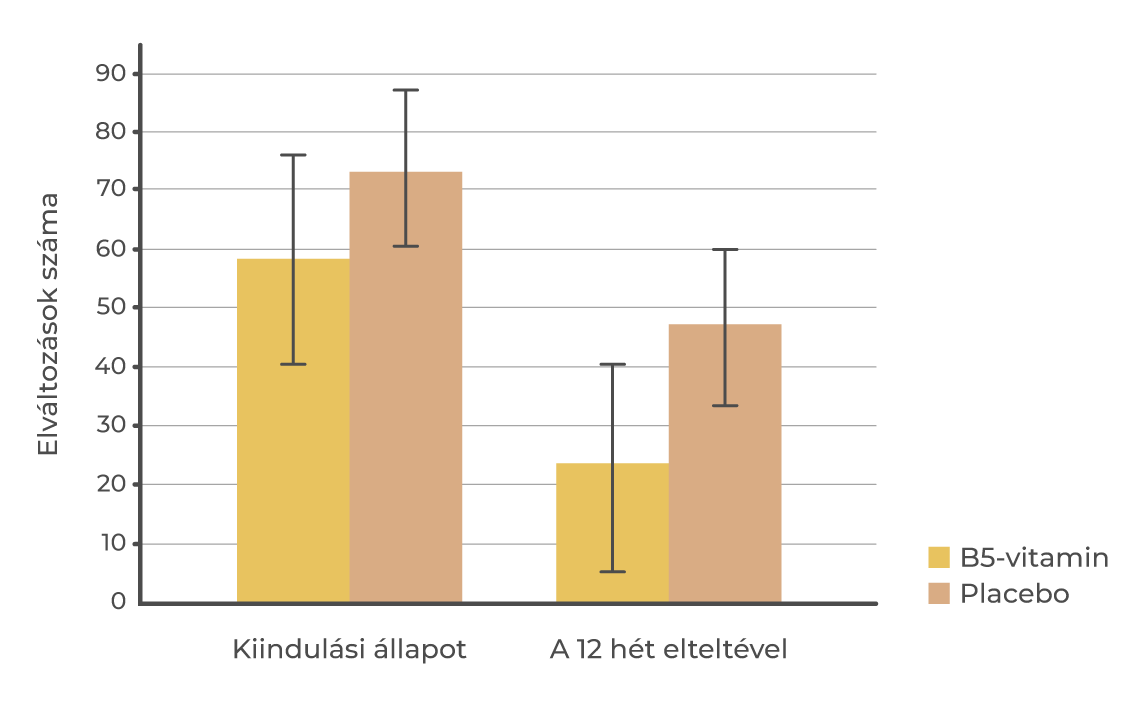 - A hegek és pattanások változásainak arcterületenkénti megoszlása szintén jelentősen javult több kategóriában a B5-vitamin hatására.