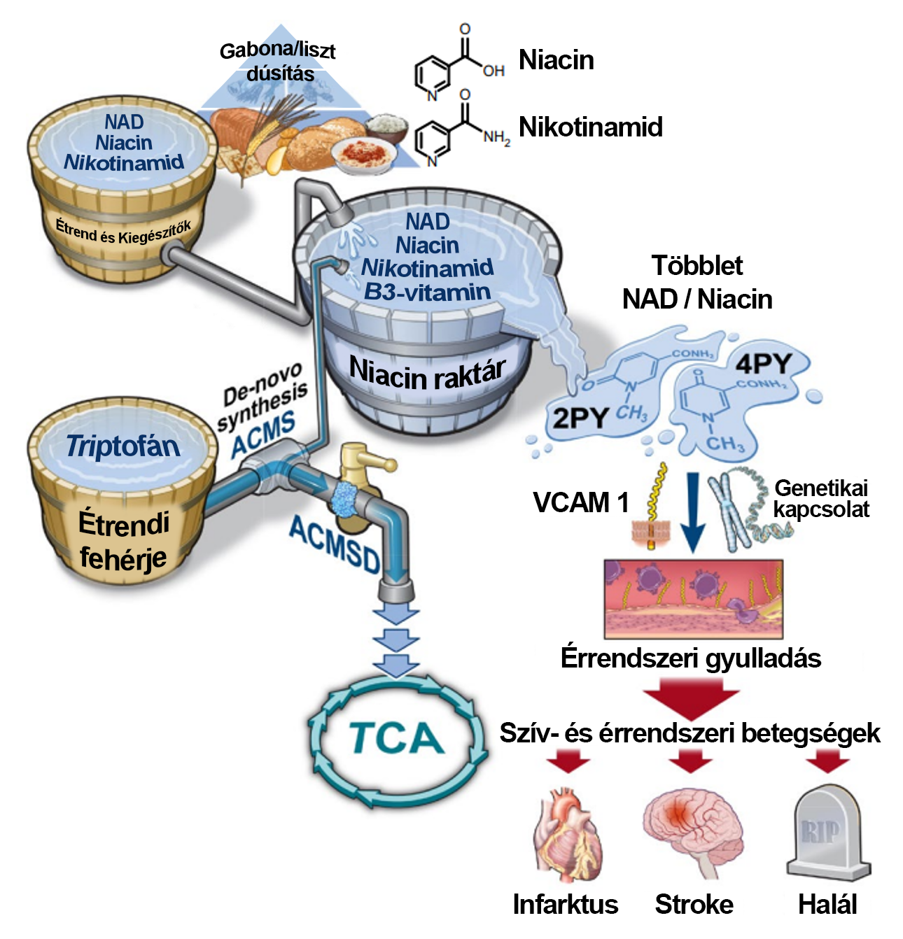 Könnyen elképzelhető, hogy a most azonosított 4PY szintjének növekedése ad magyarázatot ezekre a vegyes eredményekre. A vérlipidek túl magas szintje nagyobb kockázatot jelent, amin segíthet a niacin, azonban a B3-vitamin túlzott bevitele hosszú távon szintén problémás lehet. Ha valakinél a vérlipidek eleve a normál tartományban vannak, akkor már hátrányos a B3-vitamin pótlása.